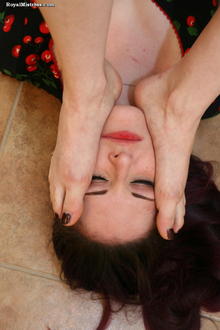 Mistress Arella is rubbing her black pumps and then her bare feet on Caroline's face and shoving them in her mouth forcing her to suck her toes