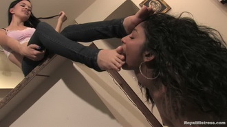 Miss Tiffany's sexy feet are dangling and her topless slave cannot resist but start licking them and sucking her toes.